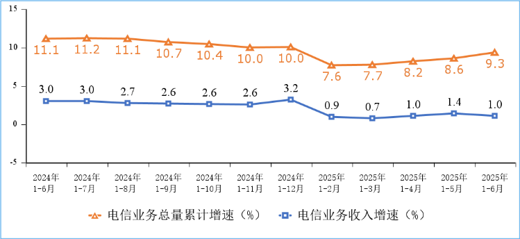 电信业务收入保持正增长,电信业务总量增长较快。上半年,电信业务收入累计完成9055亿元,同比增长1%。按照上年不变价计算的电信业务总量同比增长9.3%。